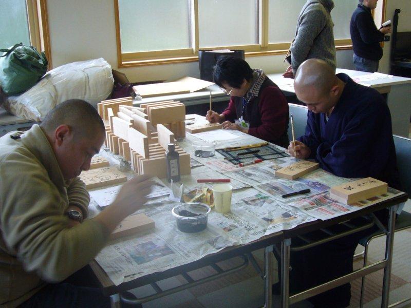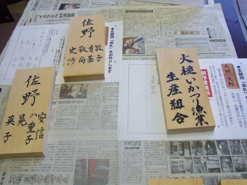 3回目となる表札書きも段取りはスムーズ、今回は個人宅用の他に今日開設という「いかつり漁業組合」のオーダーも。