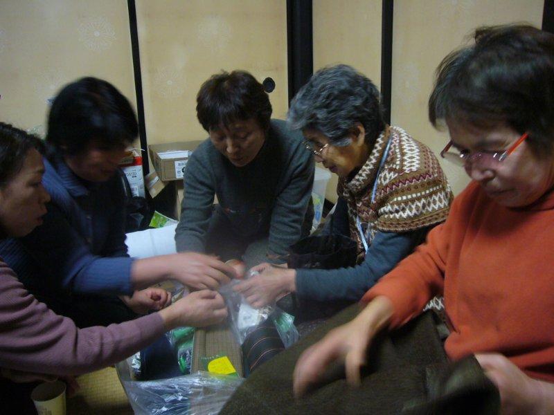 先月の訪問時に着物のリサイクルで作った綿入れはんてん配布の際、「和裁の布地や裁縫道具があったら…」との声を受けてお預かりした一式を提供、「仮設では手持ちぶさたなので、こういうものがあるとありがたい」との声をいただく。